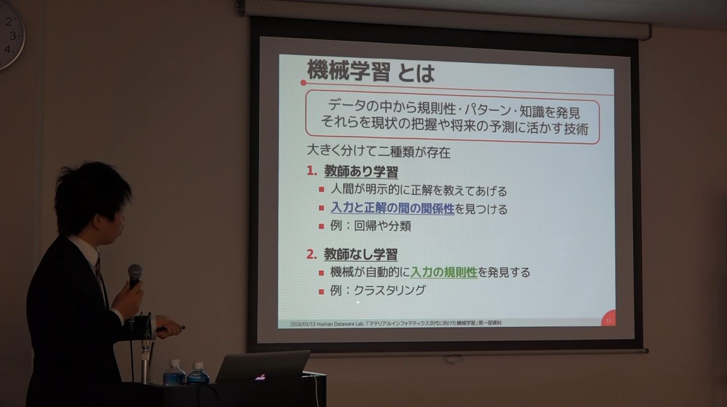 これまでは、期待する特性・性能を持つ材料の作成のために、実験・シミュレーション等の試行錯誤を繰り返すしかありませんでした。 一方で、計算機の性能の飛躍的な向上により、多数の蓄積データを効果的に処理することが可能となりました。 そこで、計算機を利用して過去の蓄積データを情報科学的に解析することで、新たな材料の特性を予測しその指針を得る、「マテリアルインフォマティクス」と呼ばれる研究分野に注目が集まっています。 本講習会では、マテリアルインフォマティクスに必要不可欠な機械学習についてわかりやすく、実例を交えて解説いたしました。